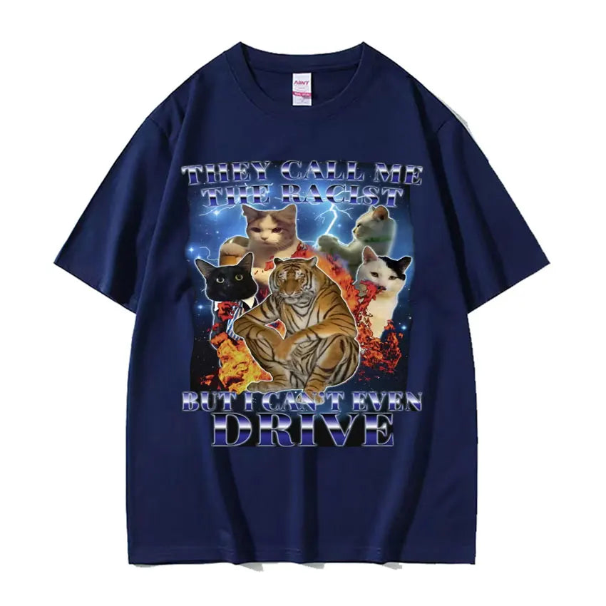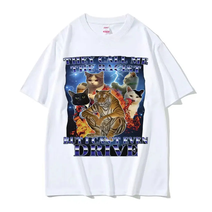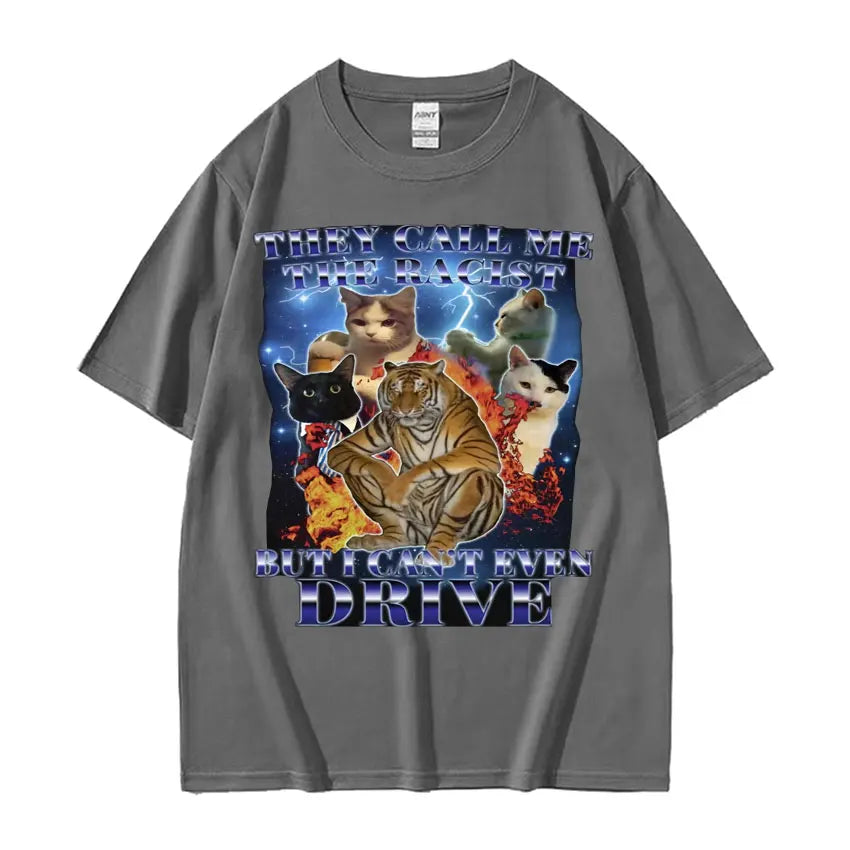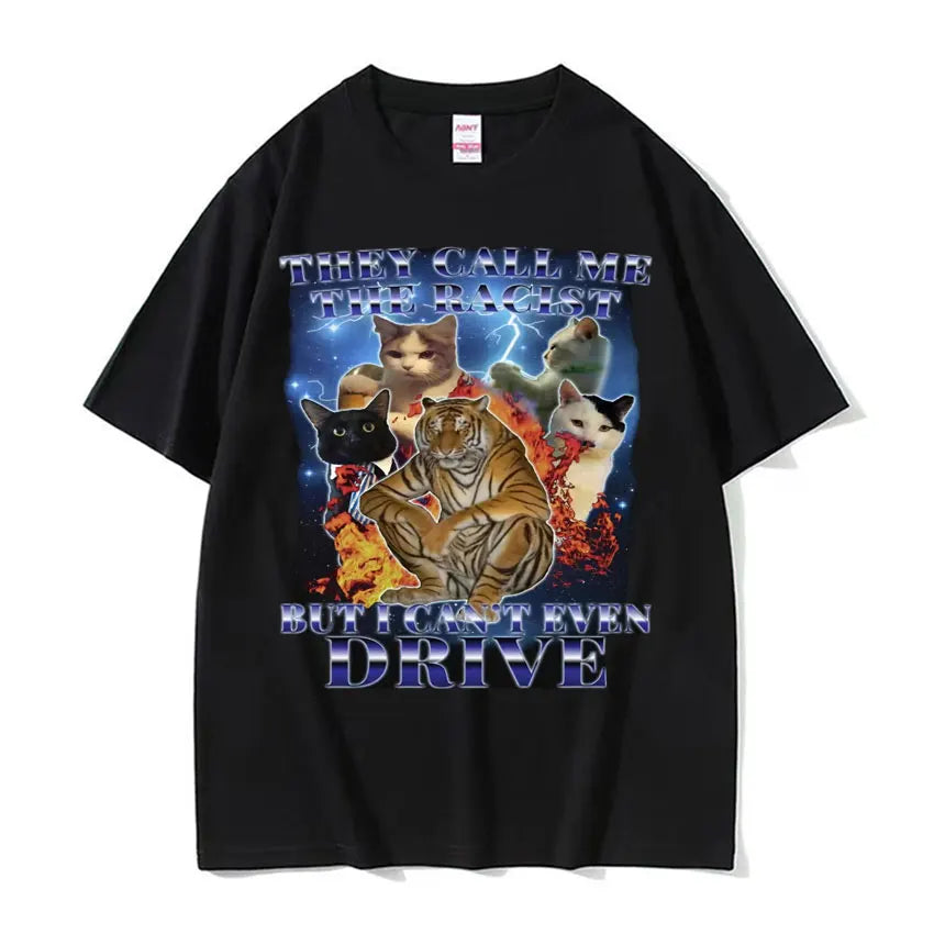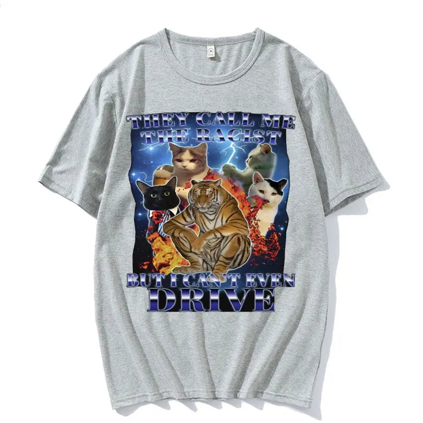 They Call Me Racist But I Cant Drive Funny Cat Meme T Shirts Men Vintage Fashion Oversized 100% Cotton T-shirt Unisex Streetwear