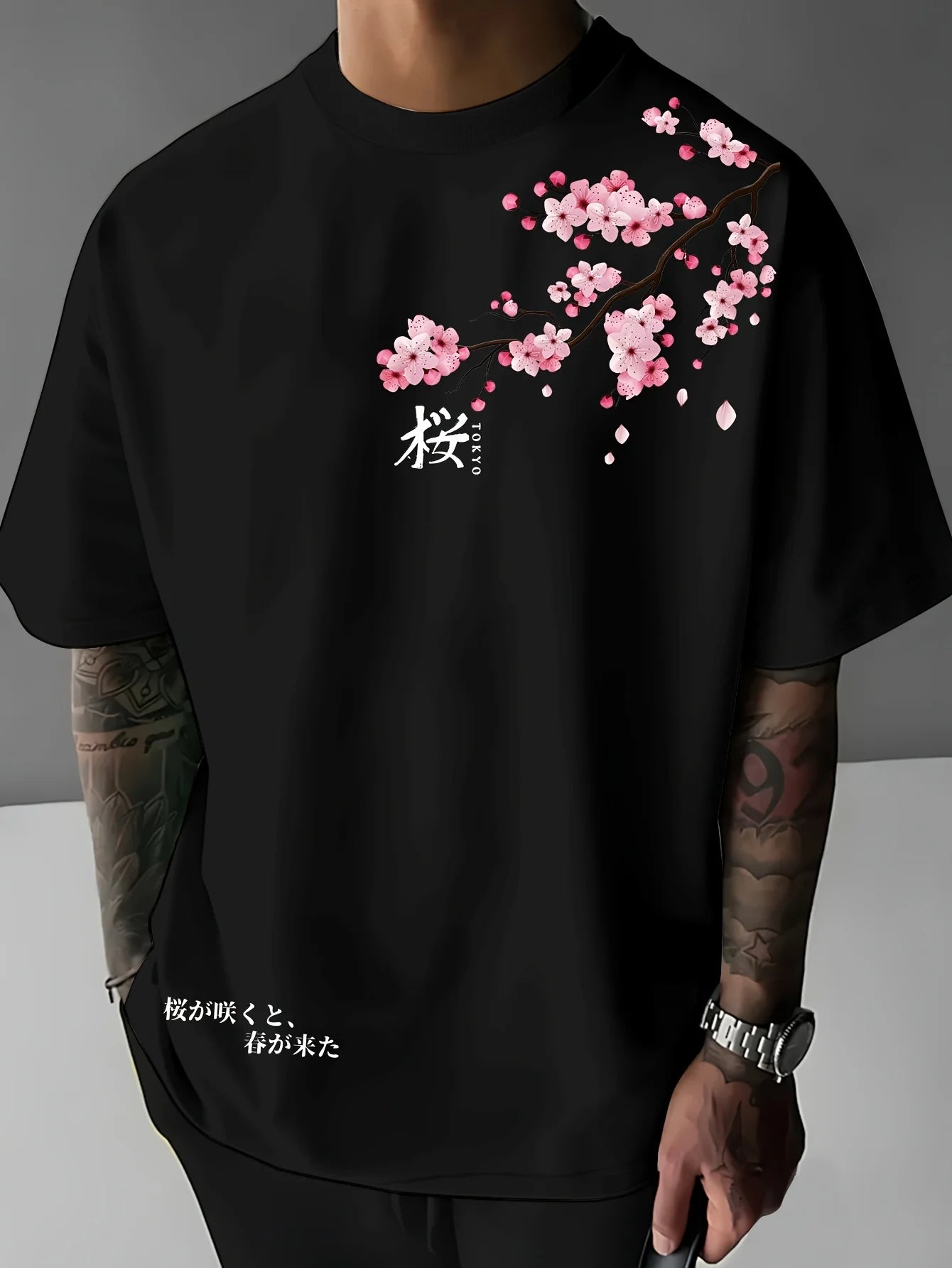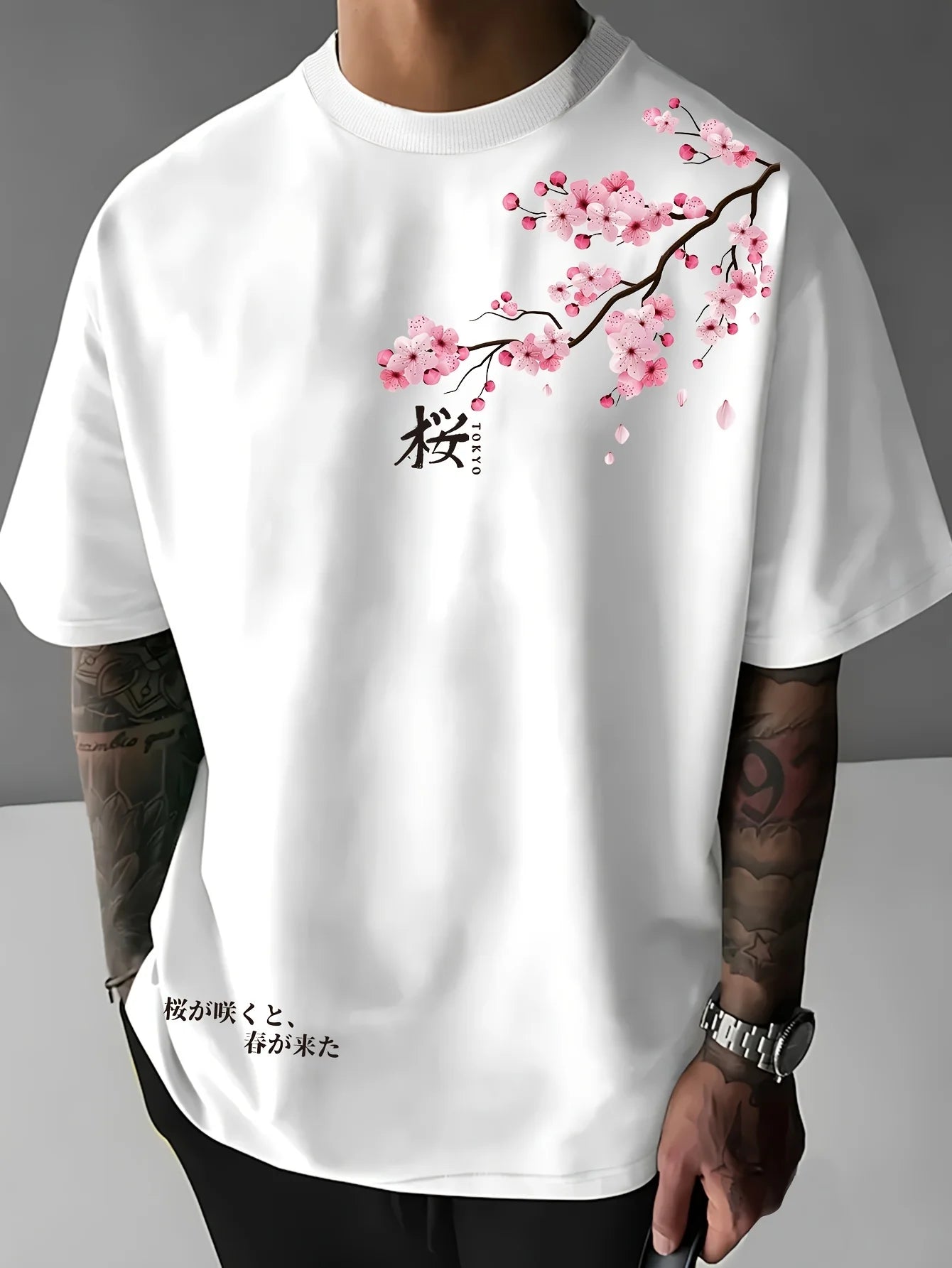 Men's cherry blossom pattern breathable polyester fiber mass casual T-shirt comfortable and breathable summer casual clothing