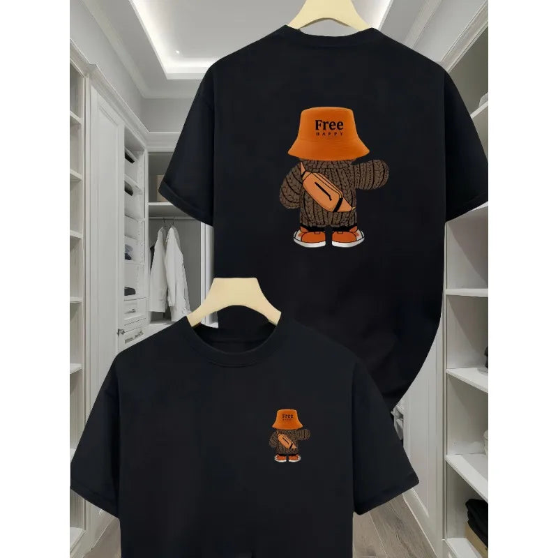 Men's 100% cotton T-shirt with backpack bear pattern casual and comfortable short sleeved round neck suitable for all seasons