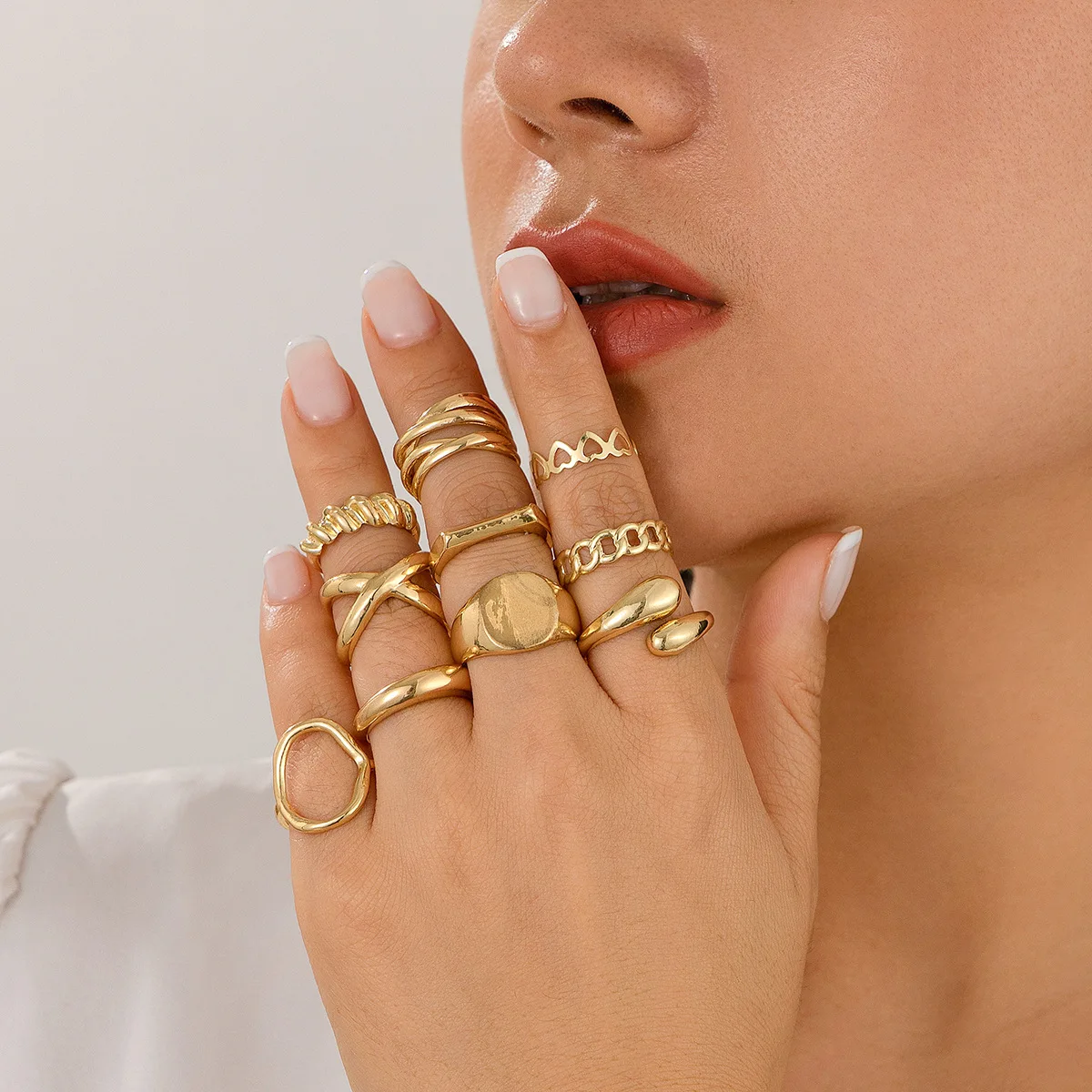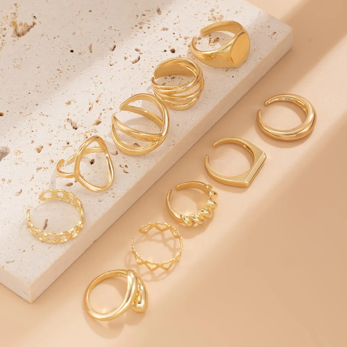 10Pcs/Set Trendy Gold Silver Color Geometric Cuff Rings Set for Women Girl Metallic Stainless Steel Minimalism Fashion Chic Ring
