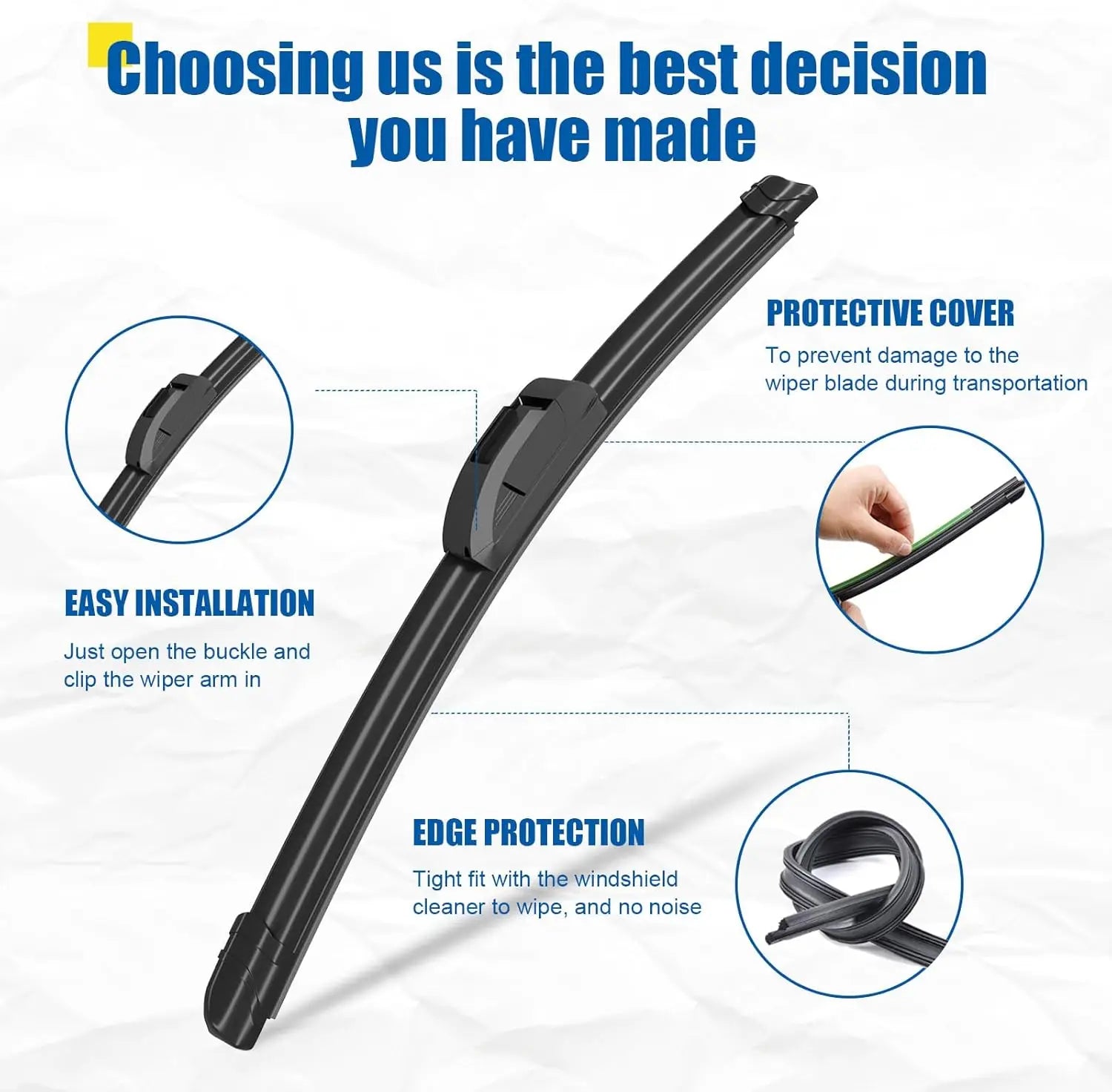 4. Tool-free installation:The J-HOOK arm makes replacement easy and can be securely fixed without any additional hardware or adjustments.Please note: Before purchasing, please confirm whether the wiper size and model are suitable for your car wiper