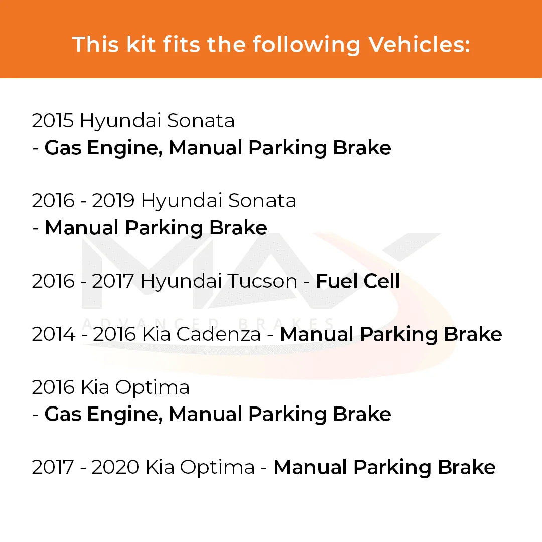 2. Perfect Fit for Your Vehicle: This brake pad and rotor kit is compatible with 2015 2016 2017 2018 2019 Hyundai Sonata Tucson w/Manual Parking Brake, 2016 2017 Hyundai Tucson fuel cell, compatible with 2016 2017 2018 2019 2020 Kia Optima w/ Manual Parking Brake, 2014 2015 2016 Cadenza w/ Manual Parking Brake| Complete Brake Kit Replacement: This automotive replacement brake kit includes 2x rear disc brake rotors + 1 set of carbon ceramic brake pads (hardware included), ready for install and no modification needed| Peace of Mind Solution: Enjoy a hassle-free 60-day returns & 1-year unlimited mileage warranty. Shop with confidence and discover the simplicity and effectiveness of our braking solutions| Shipping: Enjoy free and fast shipping on your order|Product may be shipped in multiple packages with individual tracking number
