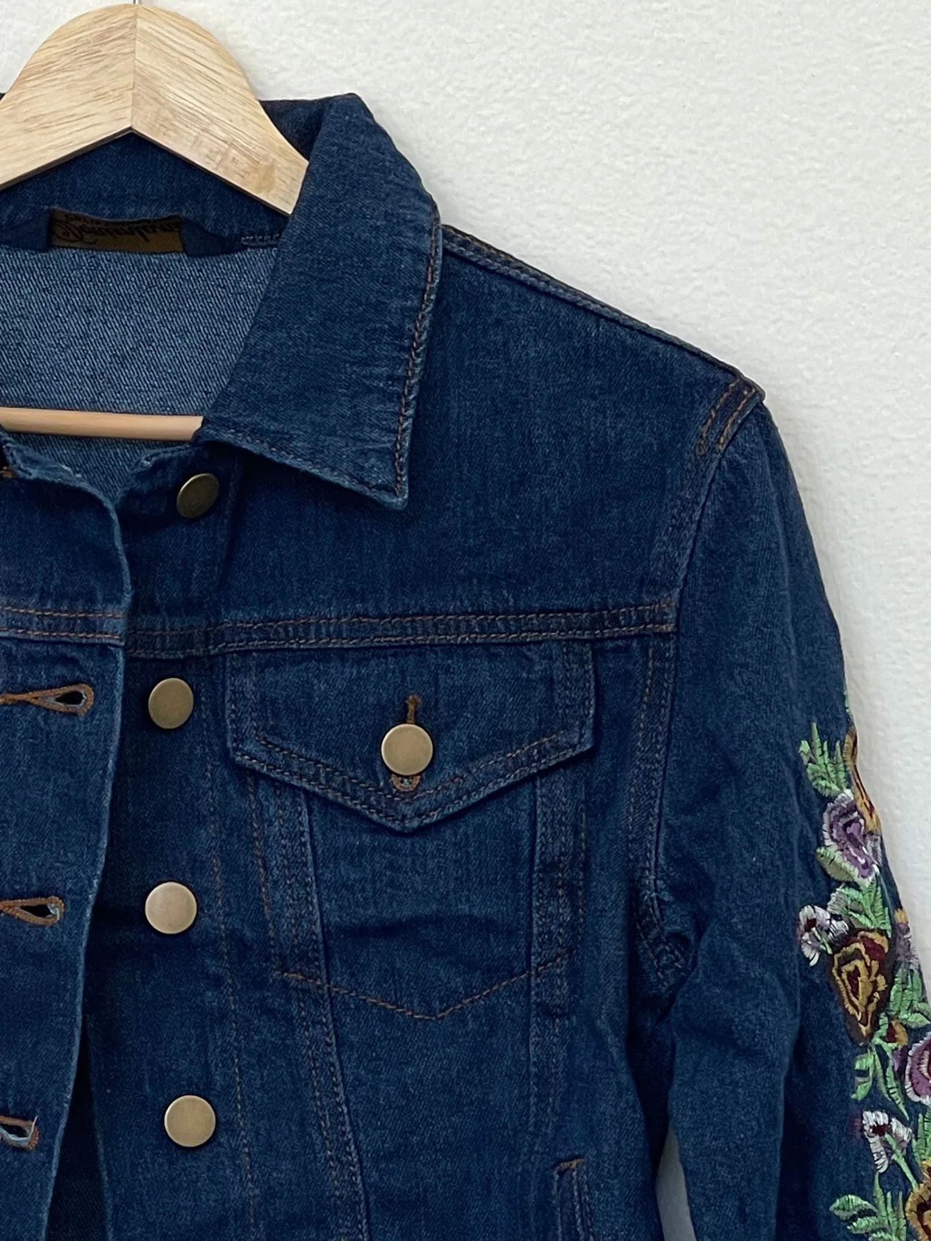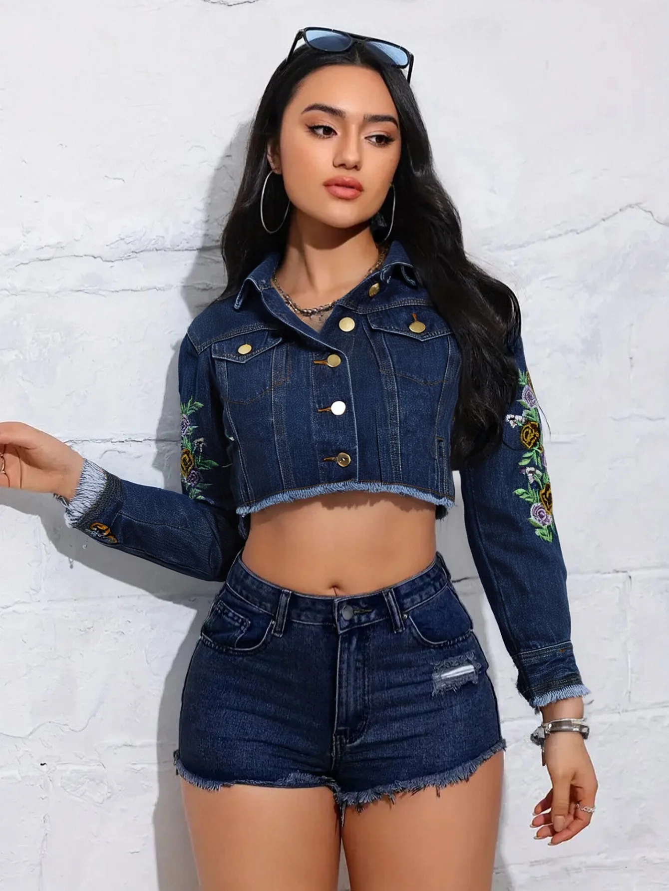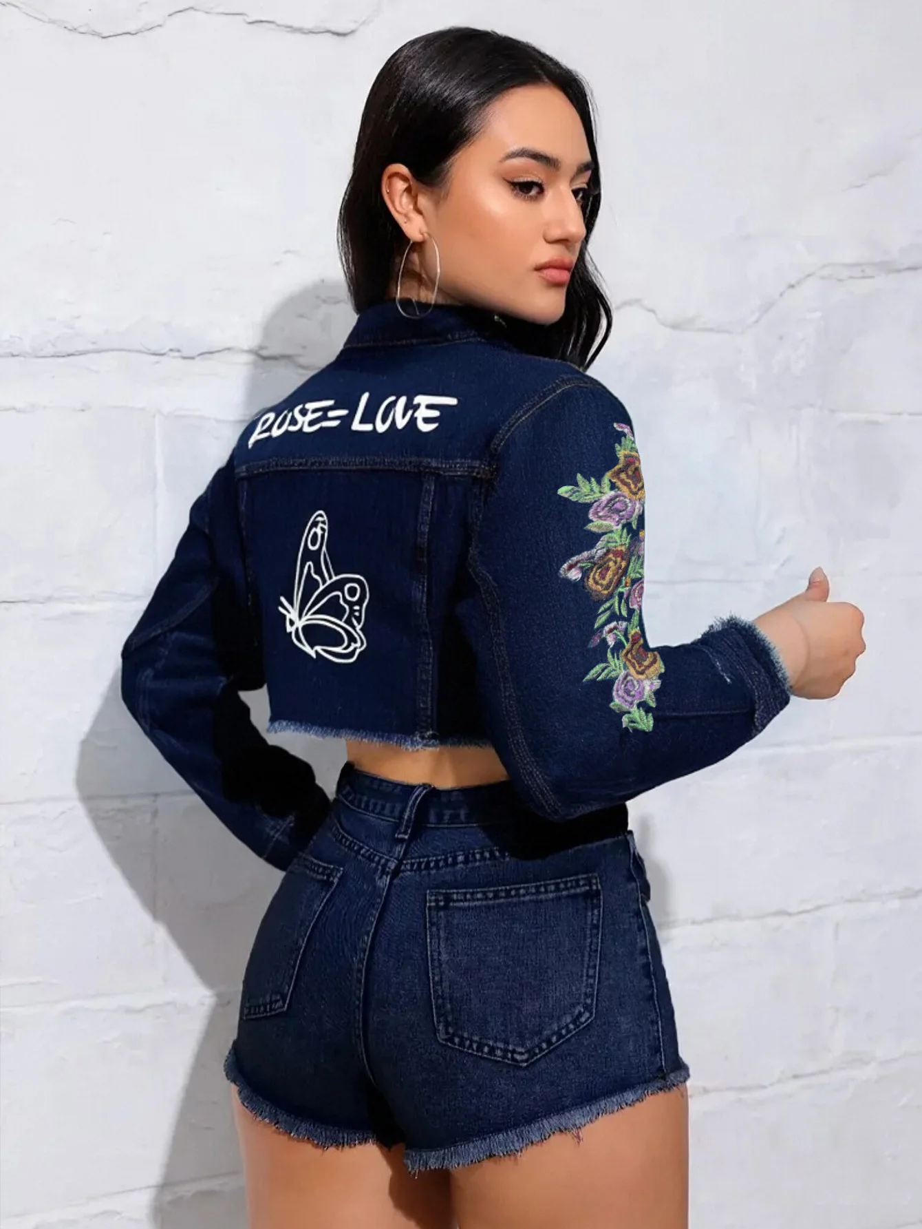 Cropped Denim Jacket for Women - Floral Embroidery & Trendy Back Print