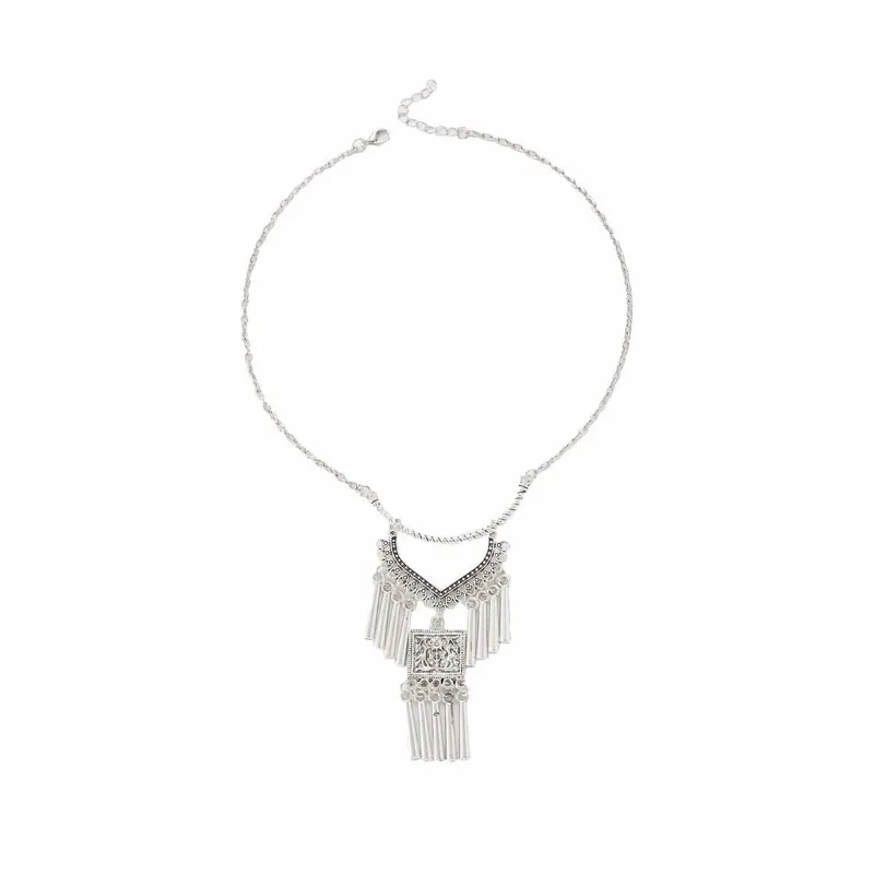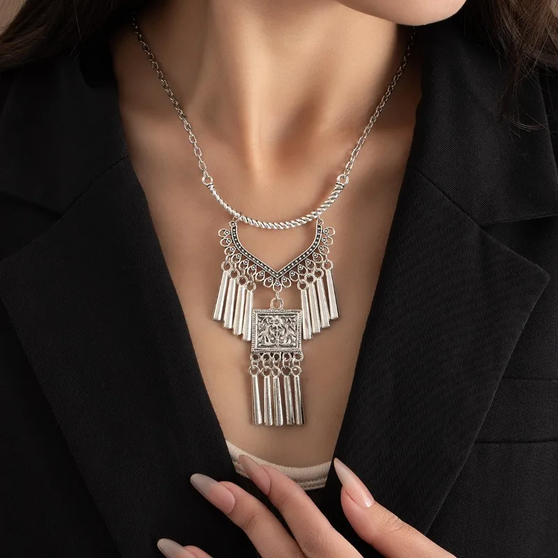 Ethnic Style Miao Silver Fringed Necklace, Bohemian Style Exotic Retro Engraved Necklace, Niche Personality Pendant Women