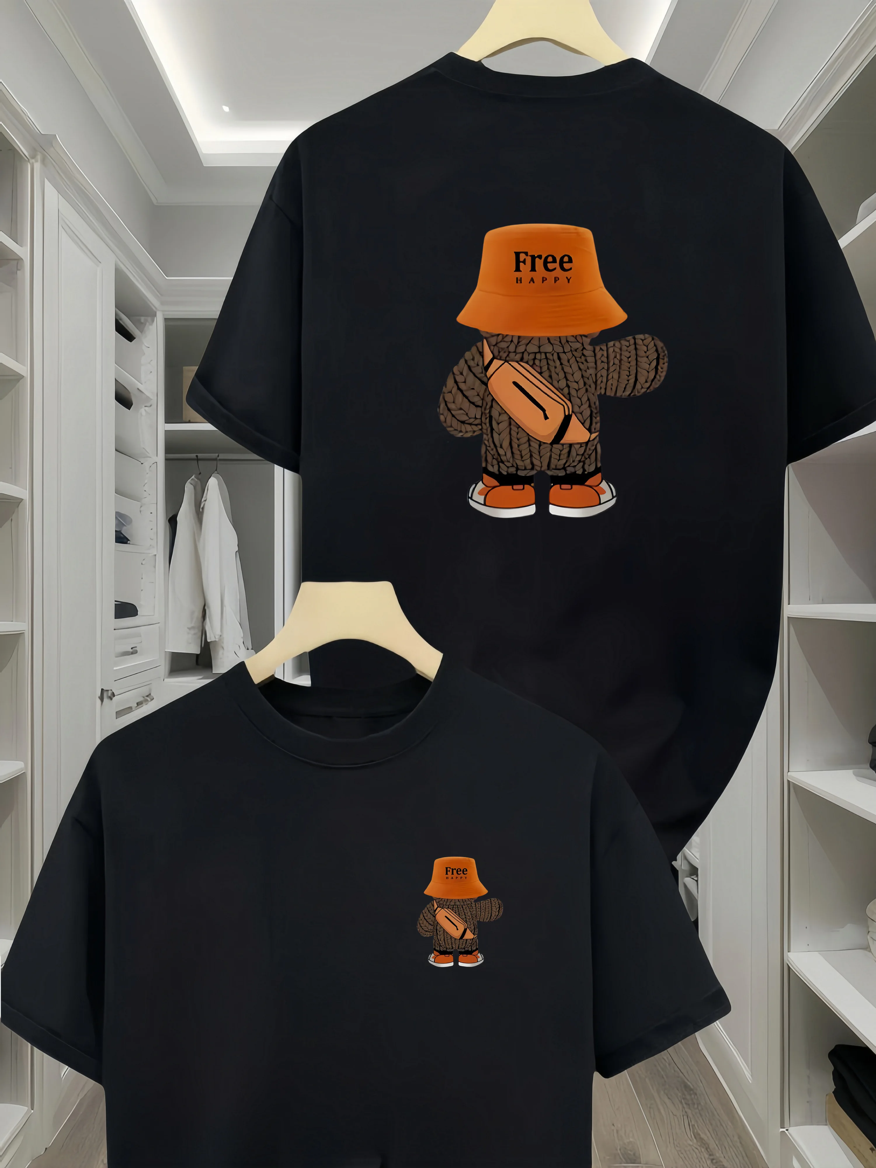 Men's 100% cotton T-shirt with backpack bear pattern casual and comfortable short sleeved round neck suitable for all seasons