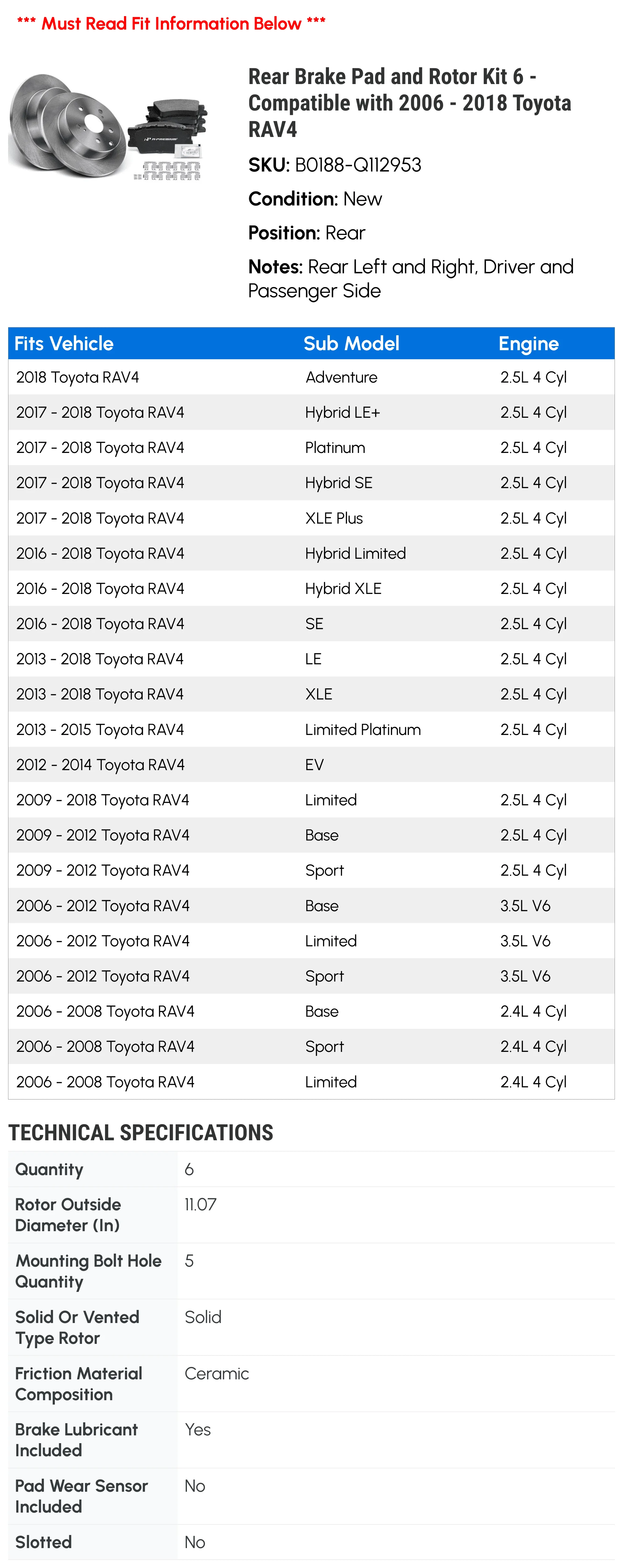 1. Rear Brake Pad and Rotor Kit 6 - Compatible with 2006 - 2018 Toyota RAV4 2007 2008 2009 2010 2011 2012 2013 2014 2015 2016 2017